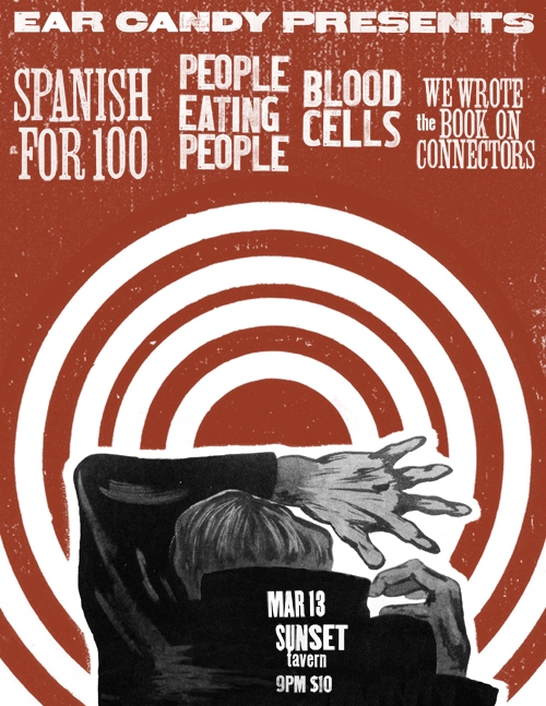 A killer show poster by Neal Castello for Ear Candy's pre-birthday bash featuring People Eating People, Spanish for 100 and…